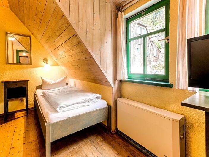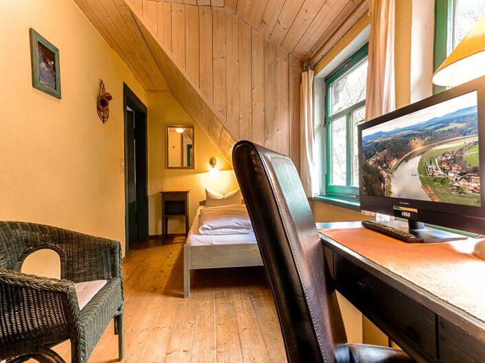 Das Haus direkt am Malerweg im Stile der 30er Jahre ist schlicht und rustikal eingerichtet. Mit viel Holz und warmen Farbtönen versprüht die Pension den Charme einer gemütlichen Herberge zum Wandern und Klettern im Elbsandsteingebirge. Eine Stube mit Kaminofen verbreitet zudem behagliche Baudenstimmung. Auf den Wanderer und Radfahrer warten 10 Zimmer auf drei Etagen. Vom Einbett- über Doppelzimmer bis zum Dreibettzimmer ist es für Einzel- und Gruppenreisende ein begehrtes Quartier in Schmilka, dem besonderen Ortsteil von Bad Schandau.