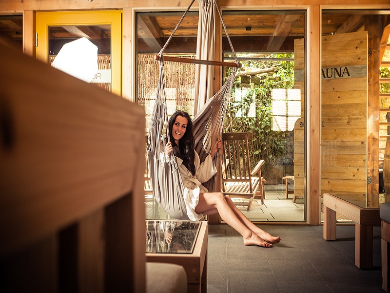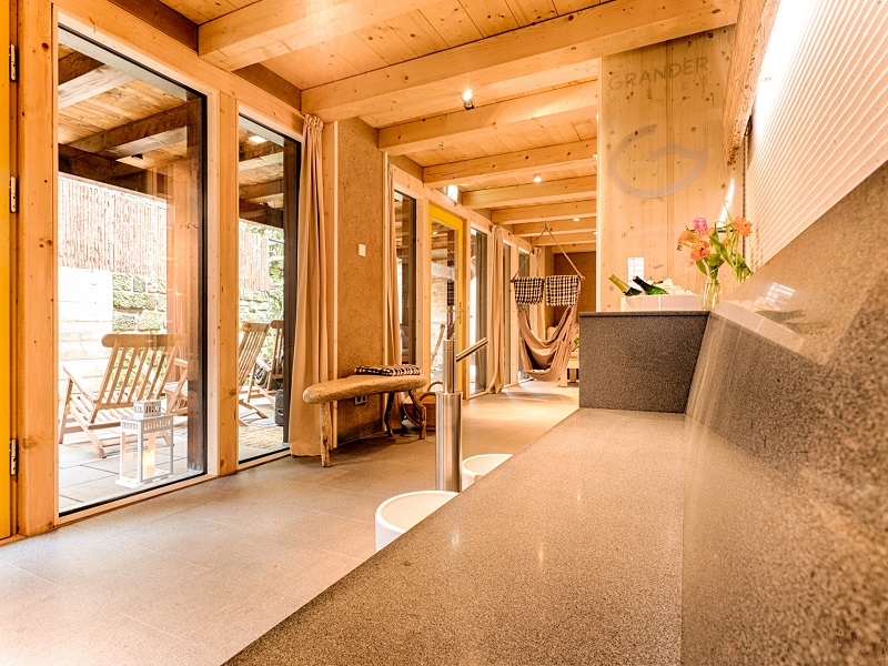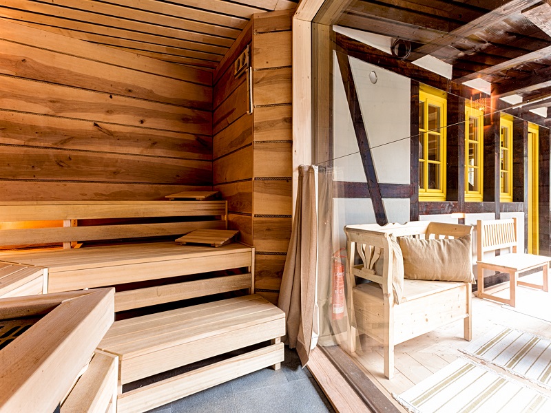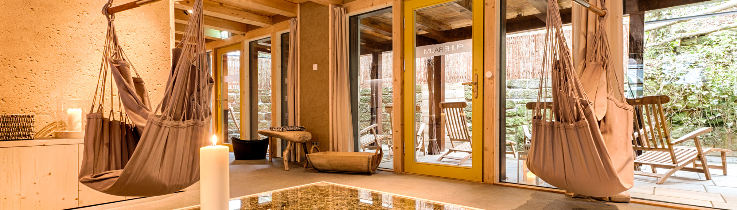 Die Panoramasauna lockt mit ihrem herrlichen Blick auf den malerischen Mühlenhof und bietet neben einer Bio-Sauna (65-70°C) und einer klassischen finnischen Sauna (90°C) auch einen gemütlichen Ruheraum mit Liegebänken und Hängeschaukeln sowie einen kleinen Saunagarten. Durch die hochwertige, gänzlich natürliche Ausstattung – angefangen von der Verwendung unbehandelter Hölzer wie Fichte und Kiefer, über Lehm-Quark-Wandputz und Granitfußboden, bis hin zu zertifiziertem Leinen und Auflagen mit Naturlatex-Füllungen, die den Ruhebereich ergänzen, ist eine einzigartige Saunalandschaft entstanden. Zur Erfrischung steht Ihnen klares Edelsteinwasser zur Verfügung.